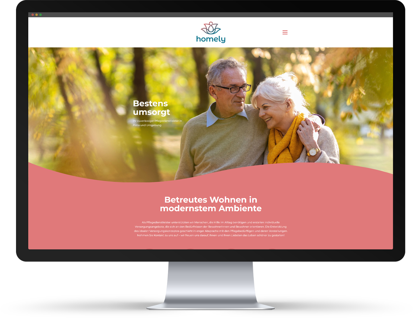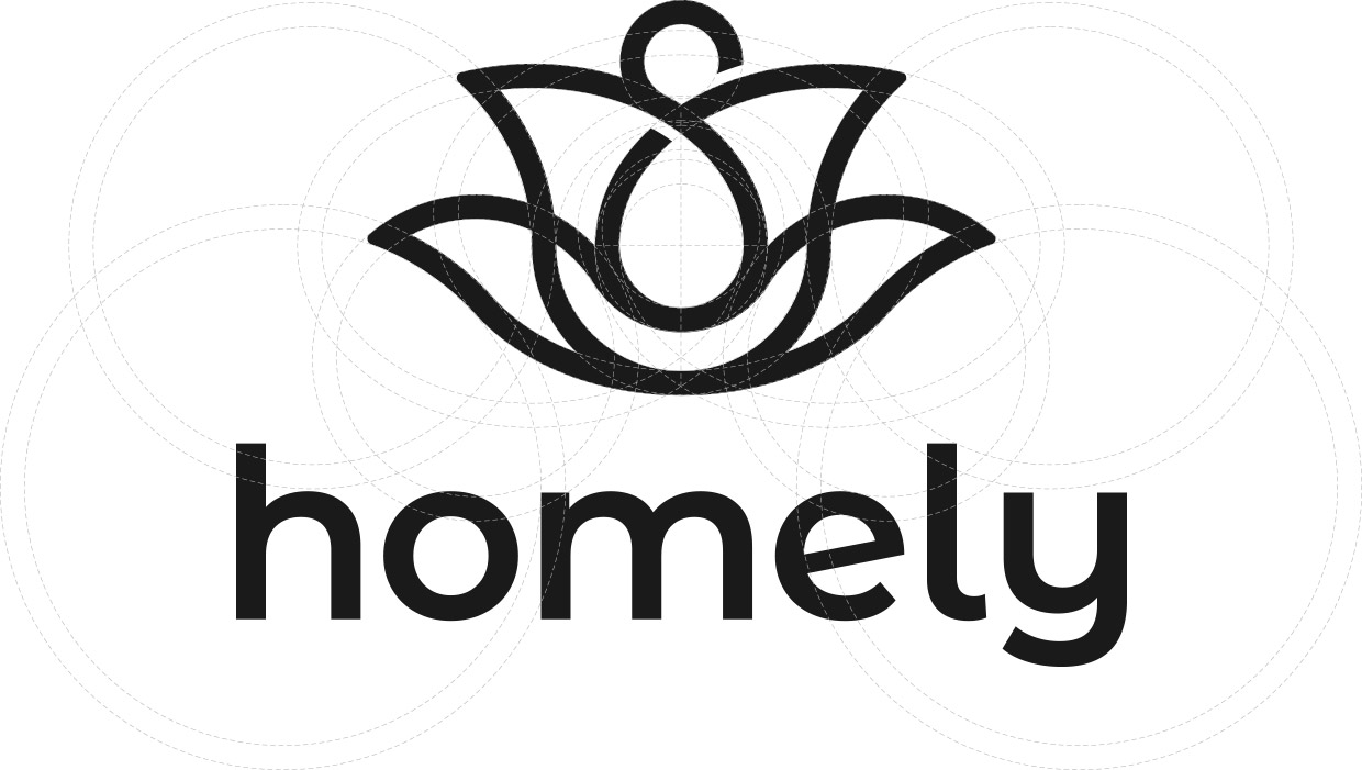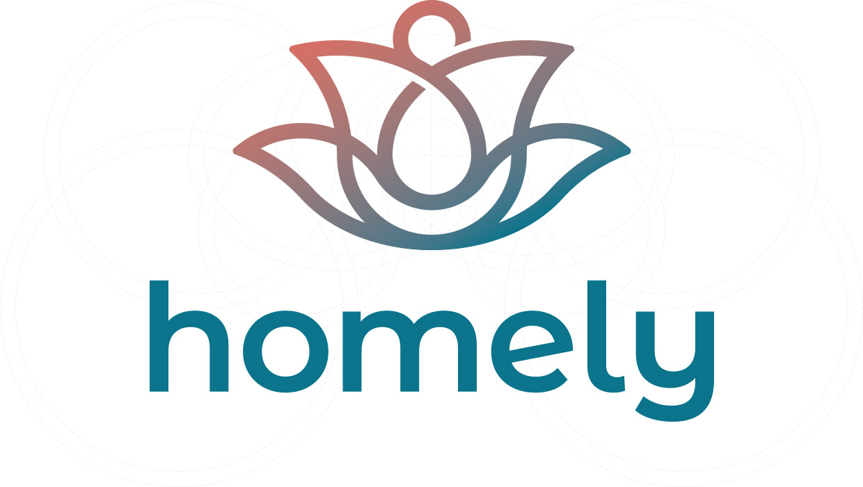 Die organischen Formen finden sich neben großflächigen, farbintensiven Gestaltungselementen und kleineren, inhaltsvermittelnden Icons auch im Logo des Pflegedienstleisters wieder. Schwungvolle Überlagerungen der einheitlichen Linien zeigen in einfacher Geometrie ein ästhetisches Element, das Raum zur Interpretation lässt: Die Darstellung einer Lotusblüte, die Blume des Lebens, wird oft mit innerer Ruhe und Harmonie in Verbindung gebracht. Zudem ist in der Symbolik die zweidimensionale Darstellung einer Person, die die Arme ausbreitet, zu lesen. Eine weitere Auslegung ist die frontale Darstellung einer Pflegefachkraft, die ein Bett aufschüttelt. Der leichte Farbwechsel, der sich durch das Logo zieht und im Namen fußt, bringt Moderne, die zeitgemäße Qualität vermittelt. Der Name homely unterstreicht die Interpretationsvarianten und den Kerngedanken, dass sich Bewohnende wie zu Hause fühlen sollen.