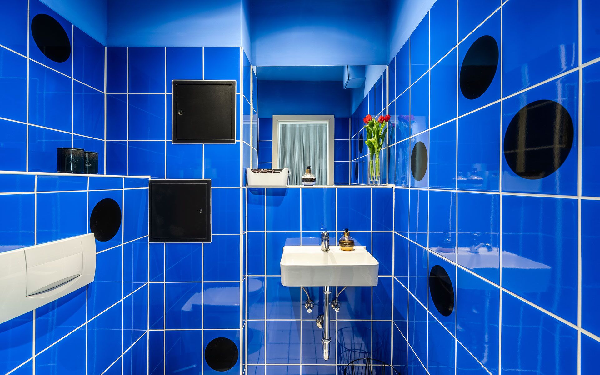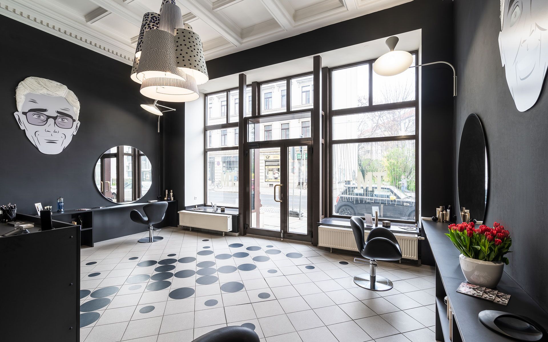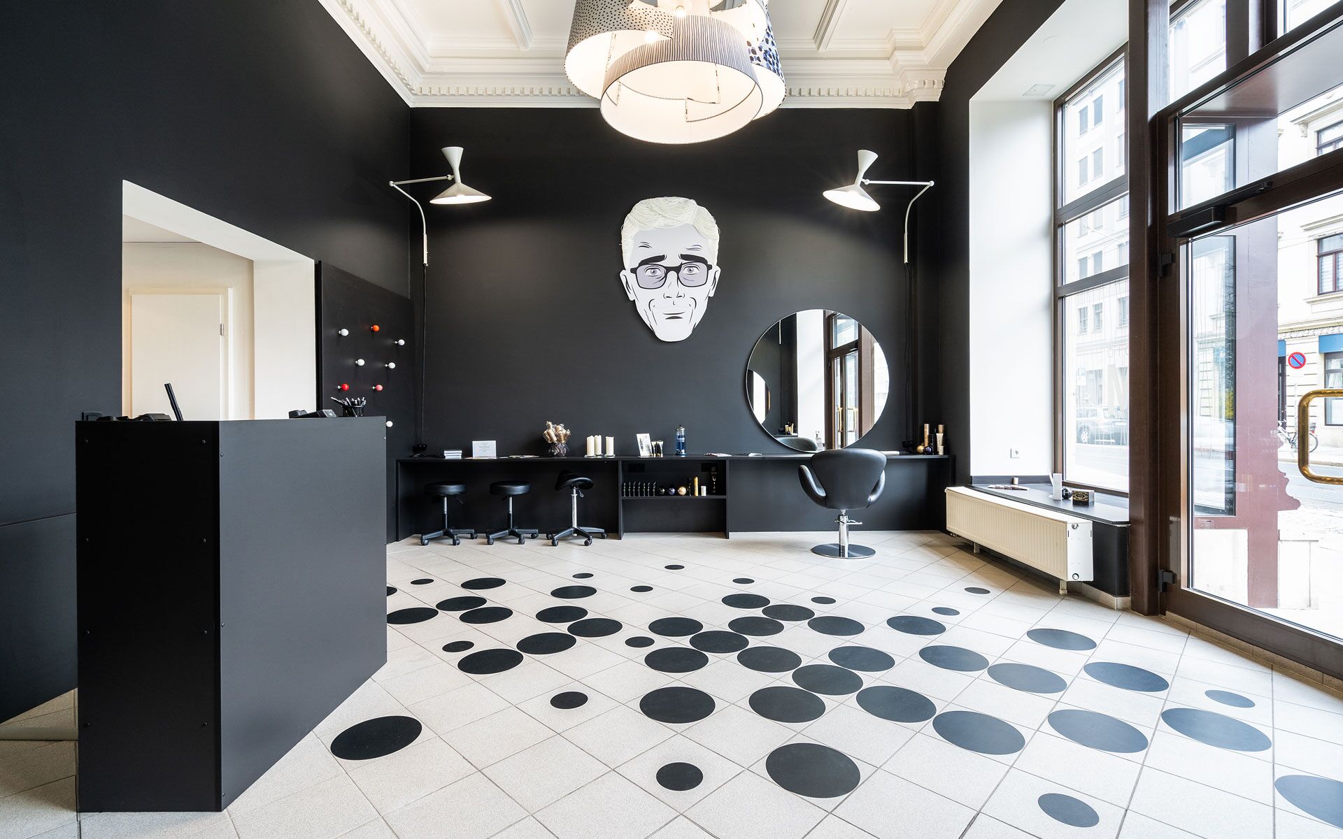Die Vermittlung der Salonatmosphäre und des Raumgefüges soll der Kundschaft anhand der Architekturfotografie schon vor Betreten des Salons aufgezeigt werden. Die Wahl der Perspektiven ermöglicht die Aussicht auf die außergewöhnliche Kassettendecke, die mit Stuck verziert ist und dem oftmals gen Decke gerichteten Blick während des Aufenthaltes, besonders im Waschbereich, etwas Schönes zur Schau stellt.