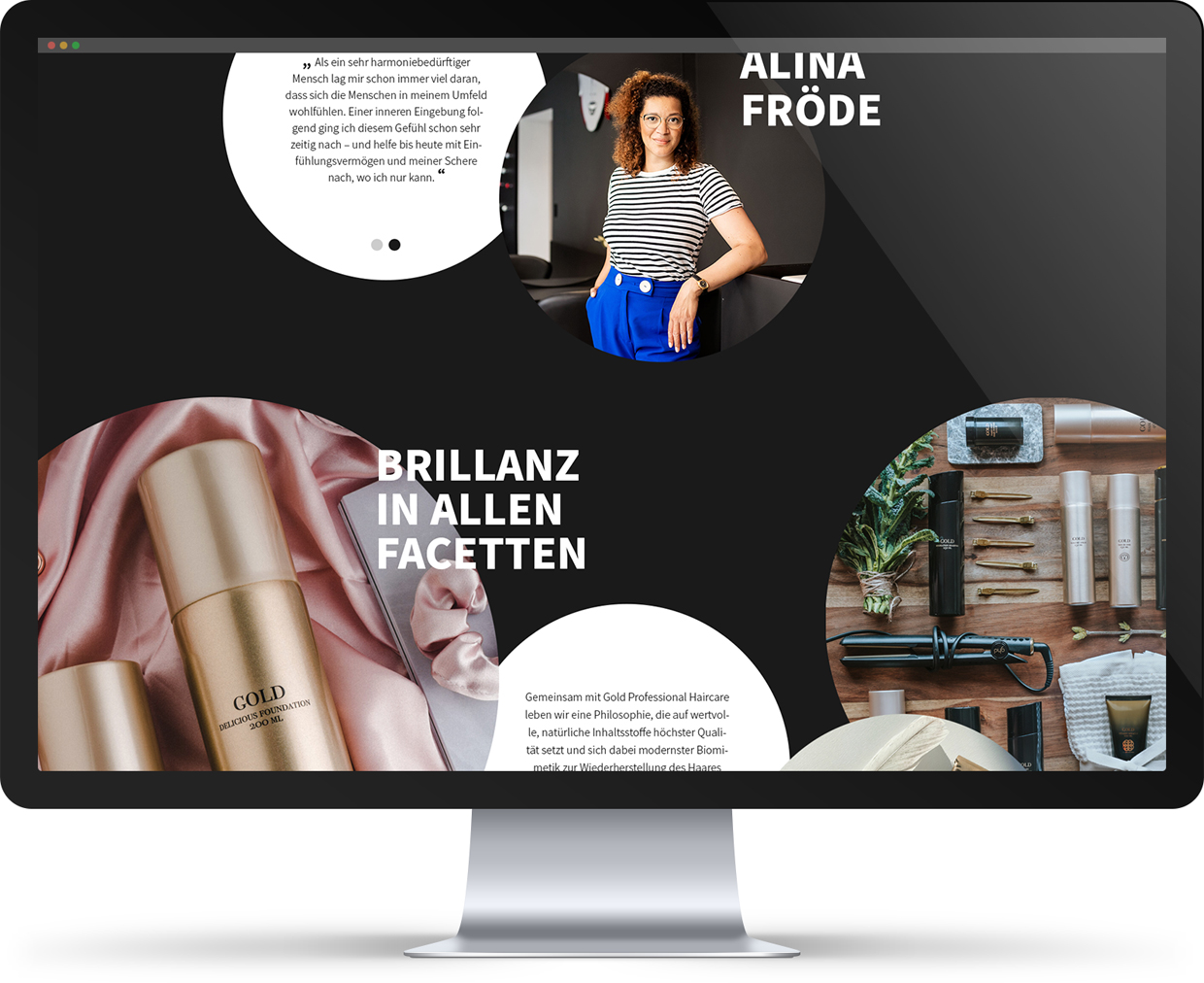 Einprägsame Schwarz-Weiß-Kontraste mit vereinzelten Farbelementen gestalten die Website spannend und modern. Der übersichtliche Onepager vermittelt klar und einfach die wichtigsten Inhalte, begonnen bei der Salonphilosophie und persönlichen Einblicken in die Vergangenheit der Friseurmeisterinnen bis hin zu Produktinformationen und Leistungen mitsamt Preisen. Um die Verbindung des Corporate Design mit dem Interieur zu präsentieren und die Ganzheitlichkeit des Konzeptes zu vermitteln, ist die Website neben wiederkehrenden Gestaltungselementen mit Fotos gespickt, die die Saloneinrichtung zeigen.